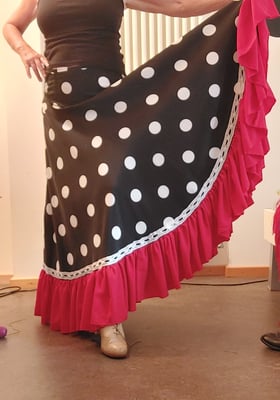 Flamenco Trainings- oder Auftrittsjupe in Viscose Gr. 36-38. Oben enganliegend unten weit. Er hat einen wunderbaren Schwung zu Fr. 49.--.